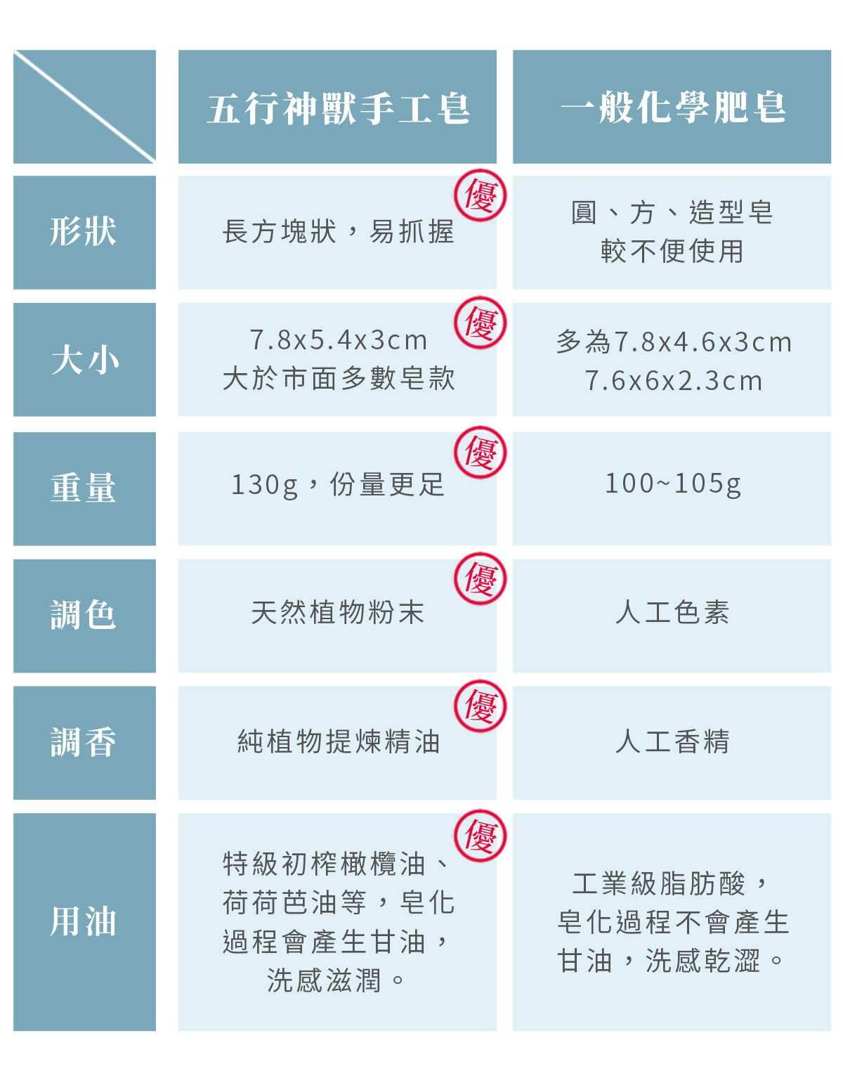 洗髮精或沐浴乳或許使用上方便,但因為是液態產品,必須加防腐劑以防變質;肥皂因為是固態,水分含量低,不需另外添加防腐劑,成份天然,排出後不汙染環境,使用上也更安心一些。